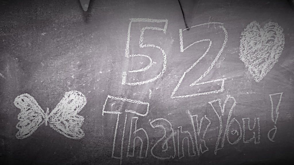Would you believe that we've been meeting every Friday for a whole year now? 52 weeks of Friday emails, going between you and me. Thanks for sticking with it!