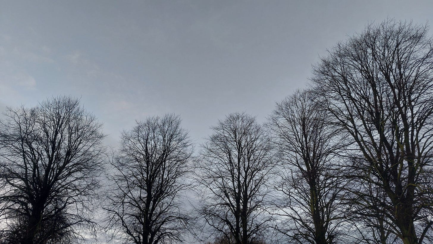 There are no leaves in its branches, no balls on their stalks, and even the bark looks necrotic, sodden from the rain. There are no buds, no young shoots. This particular specimen doesn’t wear any green coat of moss nor any puckerish sprout of intrepid fungi.